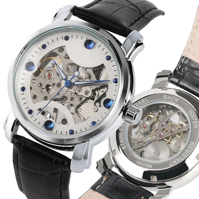 Transparent Hand Winding Mechanical Watch Leather Band Skeleton
